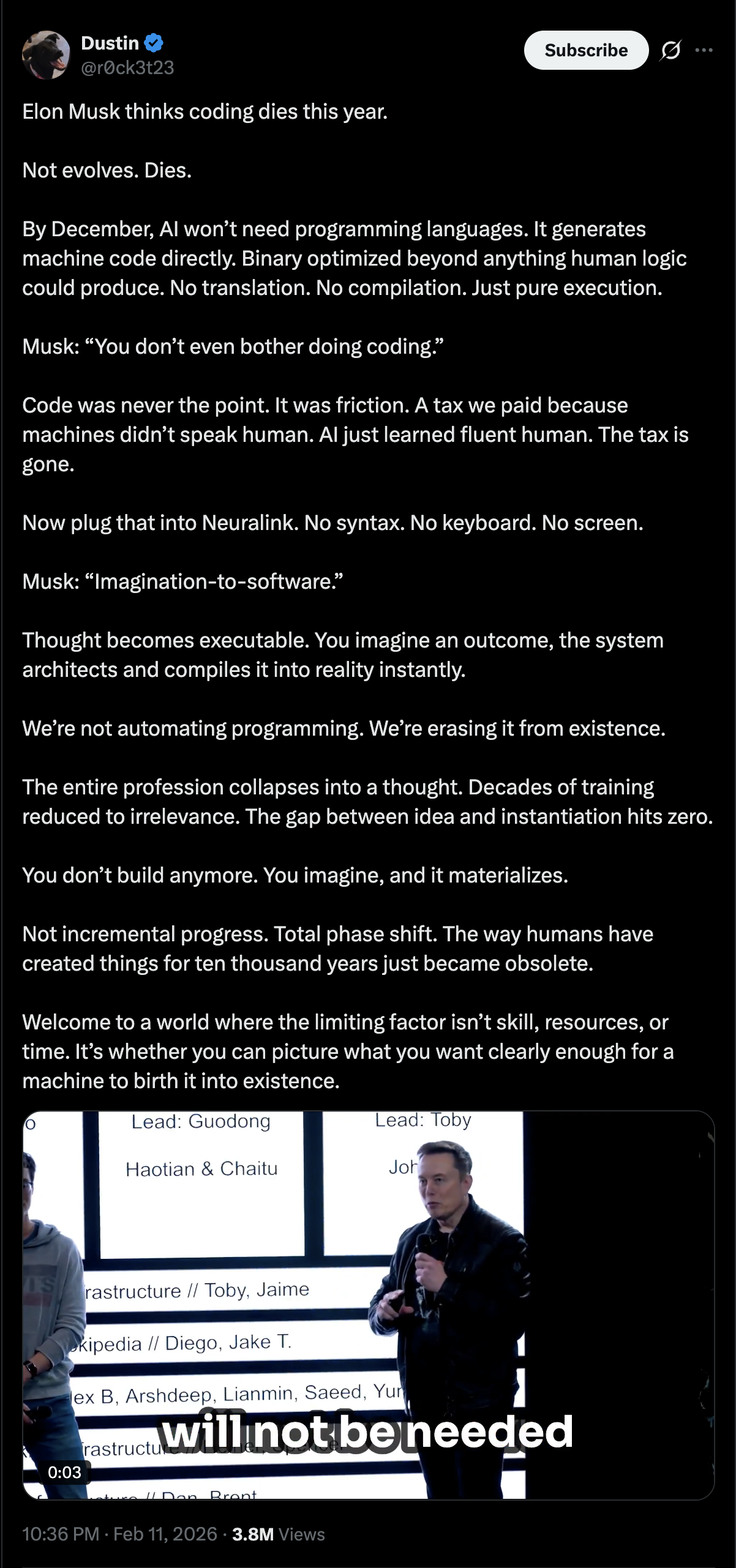 马斯克预言编程今年就会消亡。不是演变,是消亡。AI 将跳过所有编程语言,直接生成机器能运行的二进制代码。再接上 Neuralink 脑机接口,你脑子里想什么,软件就自动生成。不需要键盘,不需要屏幕,不需要任何编程知识。整个编程职业将在一年内被抹除。