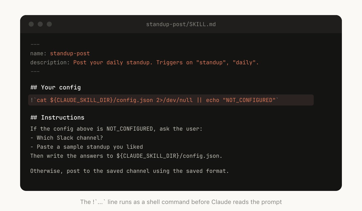 有些 Skills 可能需要用户提供上下文来完成初始设置。例如,如果你做了一个把站会内容发到 Slack 的 Skill,你可能希望 Claude 先问用户要发到哪个 Slack 频道。